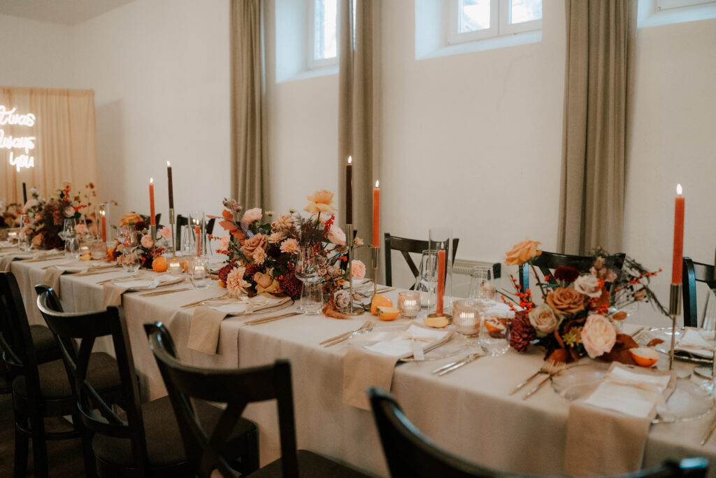 Auch das Budget spielt eine wichtige Rolle. Viele Paare berücksichtigen bei der Locationsuche nur die Raummiete, vergessen aber zusätzliche Kosten wie Catering, Servicepersonal, Technik oder Dekoration. Als erfahrene Hochzeitsplanerin helfe ich euch hier, die tatsächlichen Gesamtkosten realistisch einzuschätzen. Denn es bringt euch nichts, wenn ihr zwar eine schöne Location habt, diese aber den Großteil eures Budgets verbraucht und ihr dann an anderen Stellen sparen  müsst, die euch eigentlich wichtig gewesen wären.